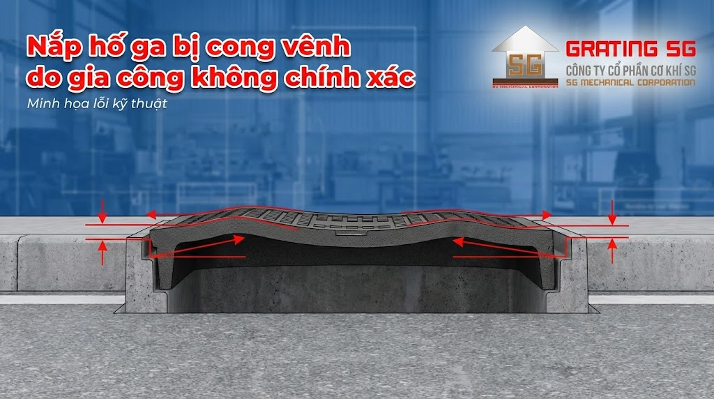 Nắp hố ga bị cong vênh do gia công không chính xác: Đây là một trong những nguyên nhân phổ biến khiến nắp hố ga phát ra tiếng ồn khi có xe chạy qua. Chỉ cần một độ chênh lệch nhỏ, nắp hố ga sẽ bị bập bênh, khi xe đi qua, lực nén làm nắp đập xuống khung, tạo ra tiếng ồn lớn.